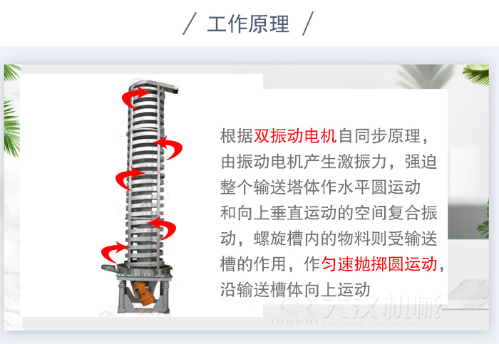 垂直提升機(jī)工作時(shí),根據(jù)雙振動(dòng)電機(jī)自同步原理,由振動(dòng)電機(jī)產(chǎn)生激振力,強(qiáng)迫整個(gè)輸送塔體作水平圓運(yùn)動(dòng)和向上垂直運(yùn)動(dòng)的空間復(fù)合振動(dòng),螺旋槽內(nèi)的物料則受輸送槽的作用,作勻速拋擲圓運(yùn)動(dòng),沿輸送槽體向上運(yùn)動(dòng),從而完成物料的向上(或向下)輸送作業(yè),因此本設(shè)備也被成為振動(dòng)垂直輸送機(jī)。