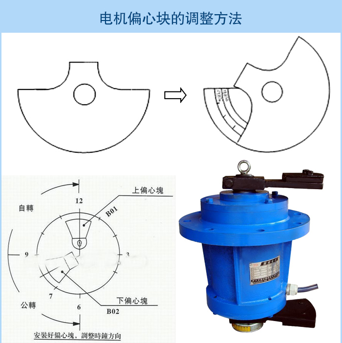 2、臥式振動電機通過改變偏心塊夾角的大小來調(diào)節(jié)偏心塊,夾角越大激振力則越小,反之夾角越小激振力越大,兩塊偏心塊重合時激振力。