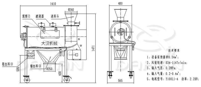 臥式氣流篩由于形狀為橫臥狀所以也叫臥式氣流篩或臥式氣流篩,網(wǎng)為圓筒狀,置于機(jī)體內(nèi),物料通過螺旋輸送系統(tǒng)后,和氣流混合、霧化進(jìn)入網(wǎng)筒內(nèi);通過網(wǎng)筒內(nèi)風(fēng)輪葉片使物料同時受離心力和旋風(fēng)推進(jìn)力,從而近使物料噴射過網(wǎng),由細(xì)料排出口排出,不能過網(wǎng)的物料沿網(wǎng)筒壁從粗料排出口排出。